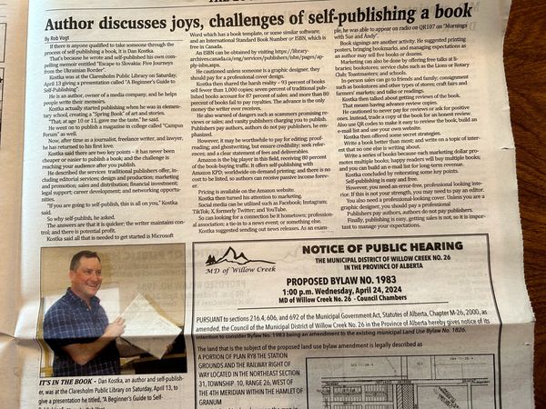 Article in the Claresholm Local Press about Dan Kostka's presentation titled "Beginner's Guide to Self-Publishing," delivered at the Claresholm Public Library.