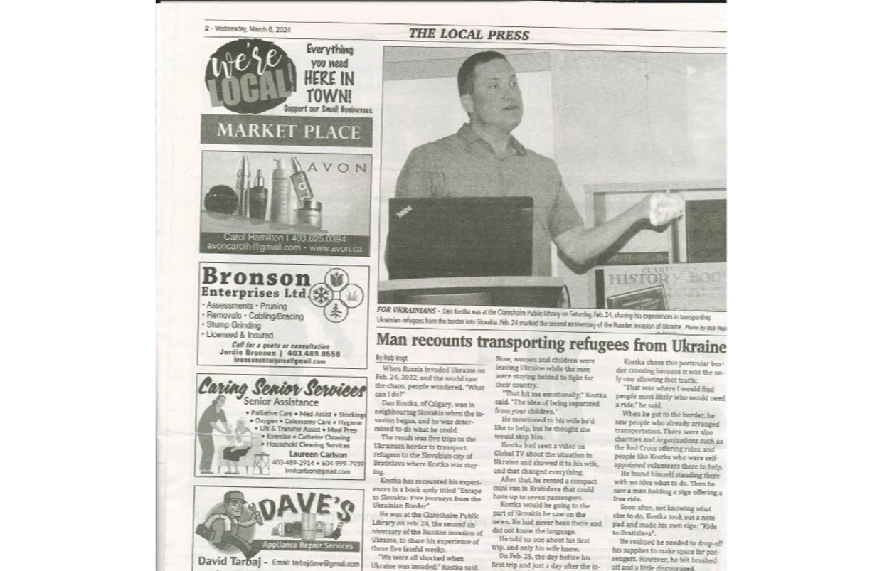 Article in Claresholm Local Press about Dan Kostka's presentation at the Claresholm Public Library about his trips to the Ukrainian border